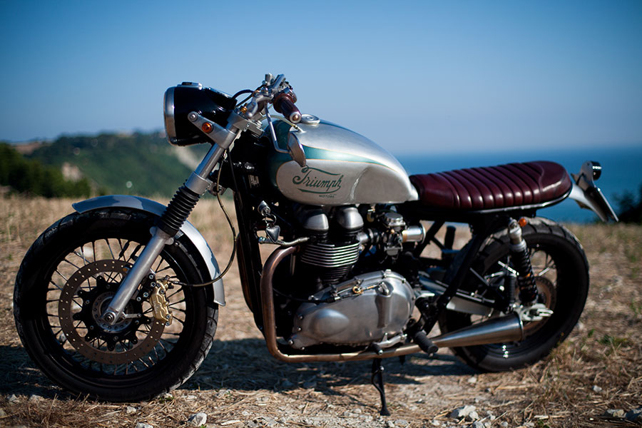 "The Drophead is born from the vision of its owner (quite a pain in the ass but a man with very clear ideas) who wanted a bonnie handmade with fine materials, not to be classified in a specific style but aggressive and with an harmonic shape. In this bike I mixed vintage components and modern goodies... It may seem a common customized bonnie but it isn’t... The Drophead is not only stylish but also fantastic to drive: the Ohlins fork and shocks, the billet triple and the aluminum swingarm with adjustable offset make it very effective on the road. The exhaust is handmade and the stainless steel mufflers (that made me crazy to build with the shape of a wizard’s sleeve … or donkey’s ass), the dynamic clutch actuator (necessary because the owner was determined as an acid drugs addicted to mount Kustomteck levers, which are hard like a dick in the morning), the Motogadget gauge built in a vintage BMW headlight, completed with a Xenon lamp, make this bike unusual... Many purists might argue that this bike is following too many different styles, but I like it, then why should I care? At the end if you look at it you’ll find it balanced and elegant... Try to handmake it if you dare... "