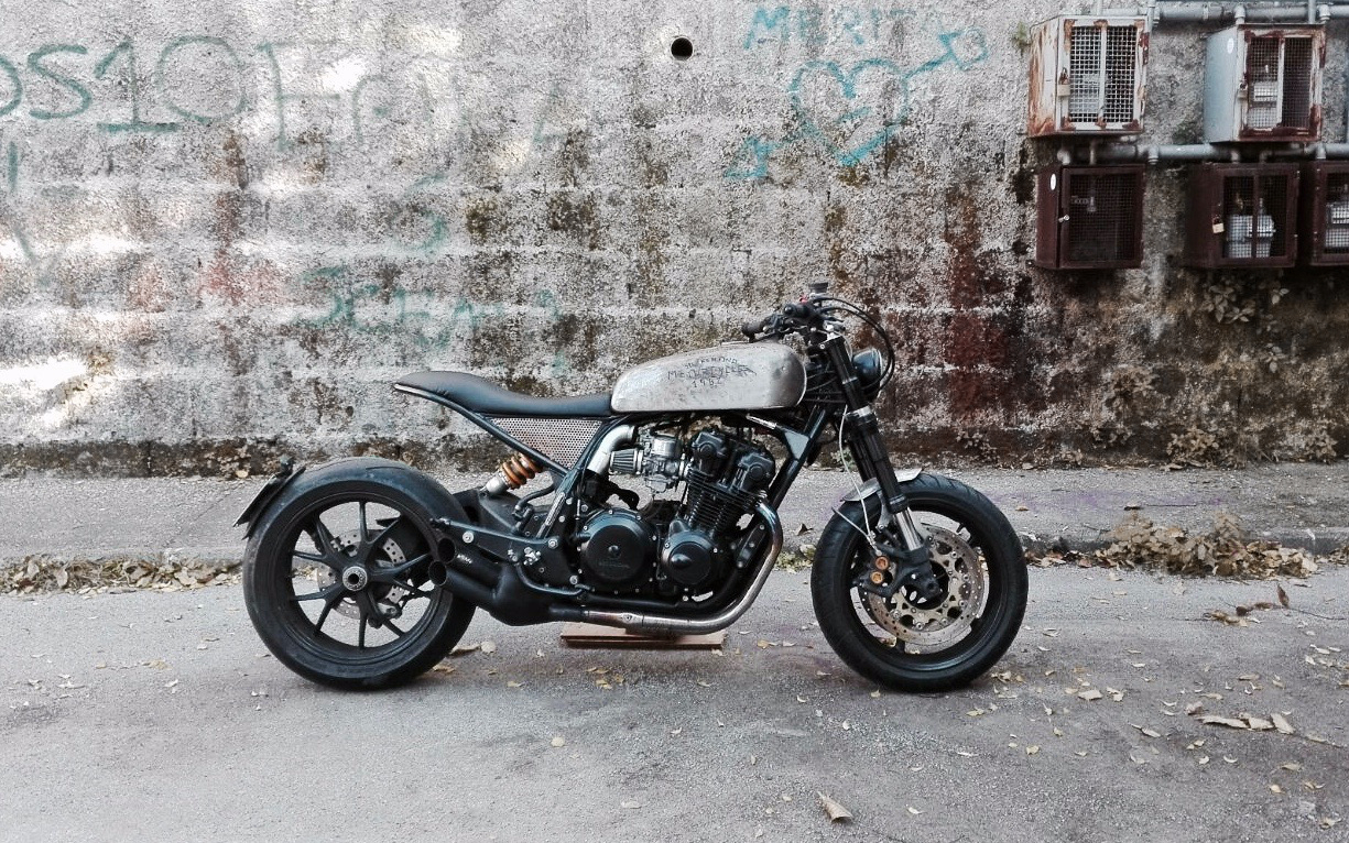 a rough 1983 CB750F with an interesting monoshock conversion and custom exhausts.