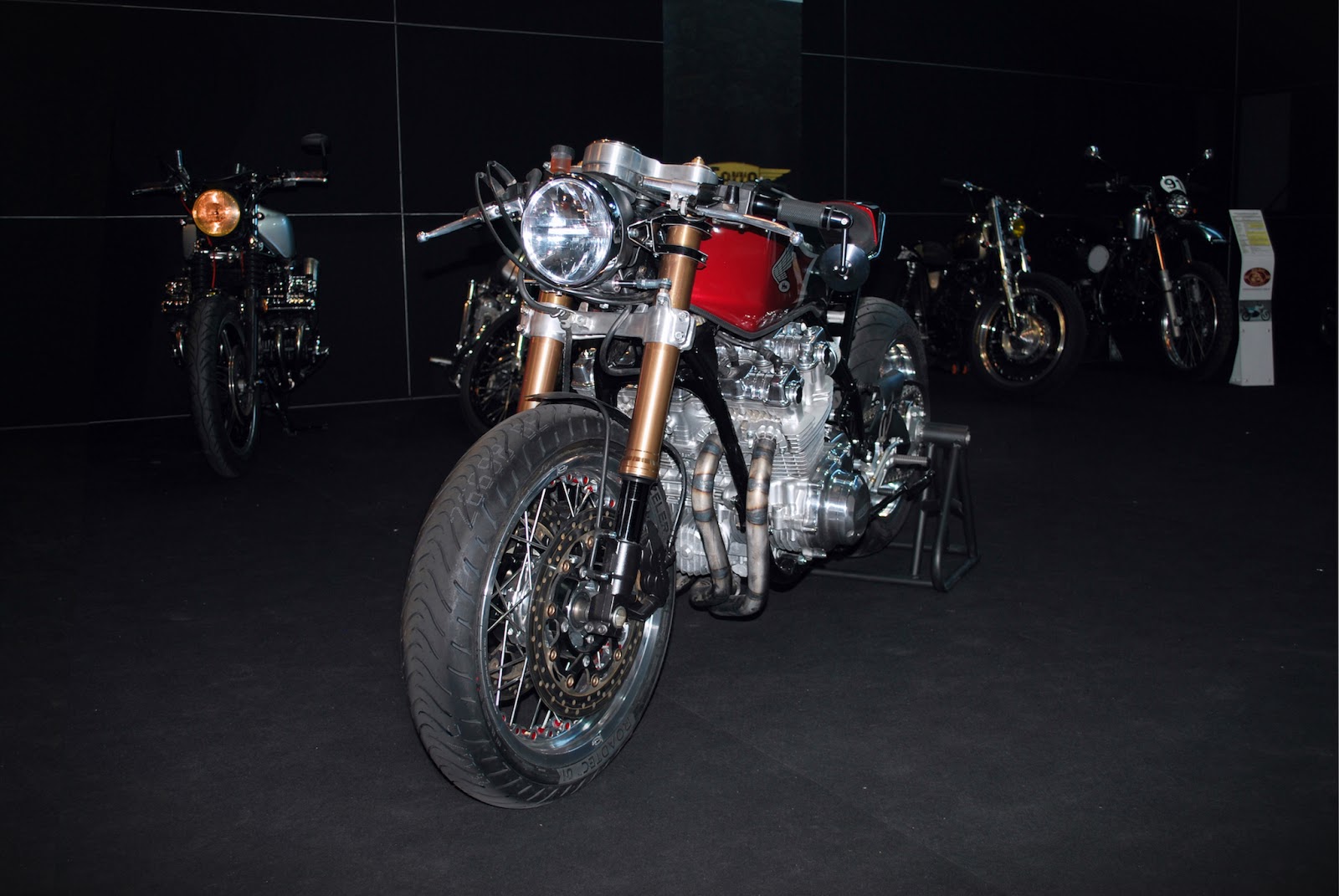 Personally, I'm not particularly excited by motorcycles' beauty contest. I usually avoid to attend, and I really don't like the complains and the arguments that tipically follow the decision of the jury. In addition, too many contests are contaminated by commercial interests and it's not a secret that sometime the podium follows, voluntarily or not, an advertisment contract entered into by the contender with the magazine which organizes the event. Nevertheless, nothing like a beauty contest gives the builders the visibility they need to find new customers and carry on their activity and express their creativity again and in different ways. This time the Honda Ferro Award went to a builder that Inazuma Cafe follows and appreciates from his very beginning. A young enthusiast from Rome whose main business up until now has been running a restaurant with his wife... As his previous projects, this super cafe racer is born in a small basement where Alessandro has been working long hours overnight and during weekends stolen to his family to complete a dream. I won't spend too many words on this bike, since the pictures speak by themselves: the CBF has been rebuilt from scratch. At the rear end an awesome single sided swing-arm and the monoshock conversion gave the bike a different stance. At the front end, a new triple tree and the inverted forks ensure full control of the power and state of the art handling on the streets of the third millenium. The custom exhausts and the air pods make the engine breath at its best. The Kineo spoke wheels and the fine paintjob finally make this rocket a real head turner. Well done Ale, keep on the good work.